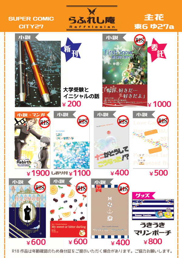5/3に開催されるSUPER COMIC CITY27(一日目)のお品書きです。